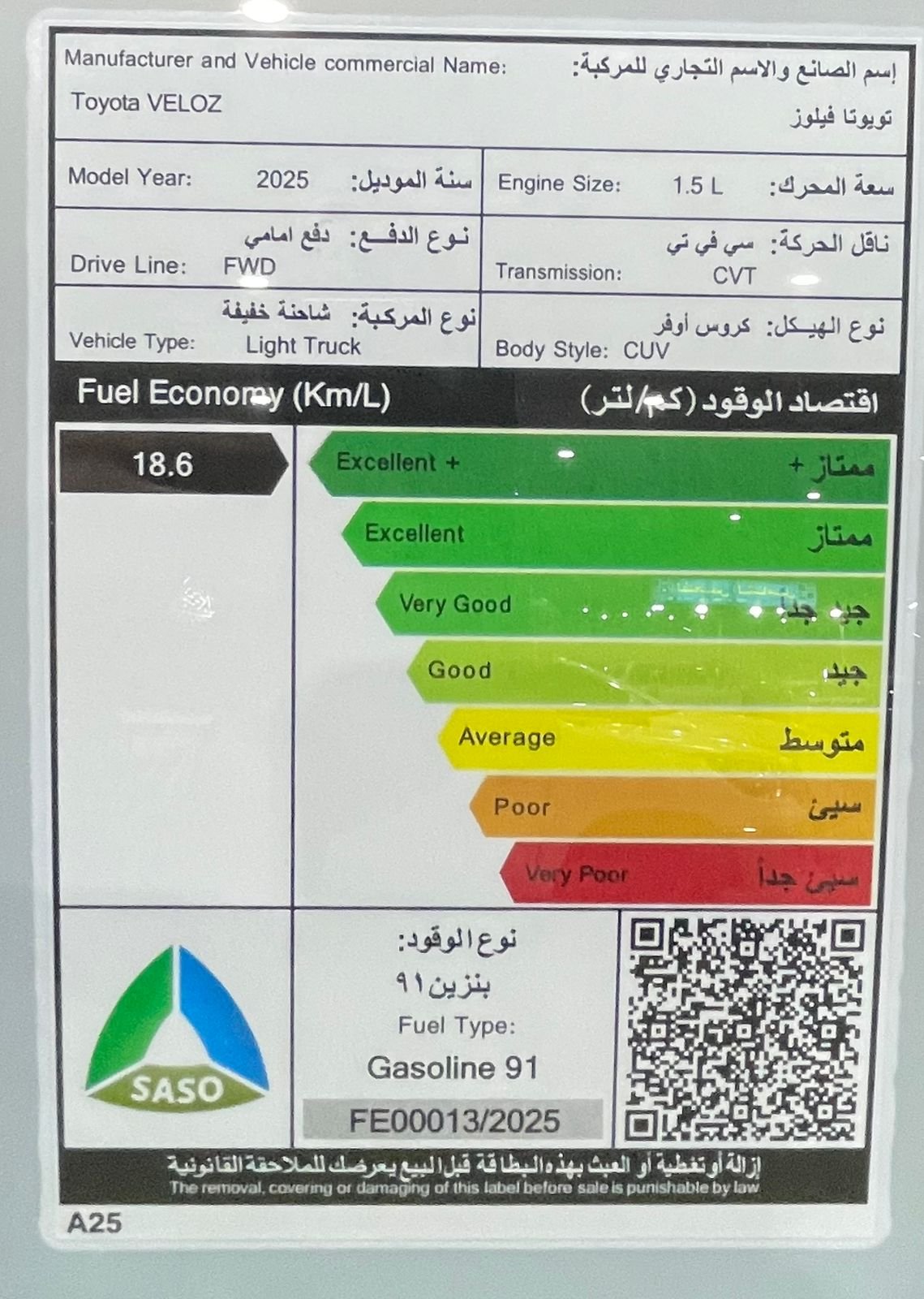 ملصق نوع الوقود 91 (منتج معتمد من تويوتا ، صنع في جنوب أفريقيا)*